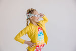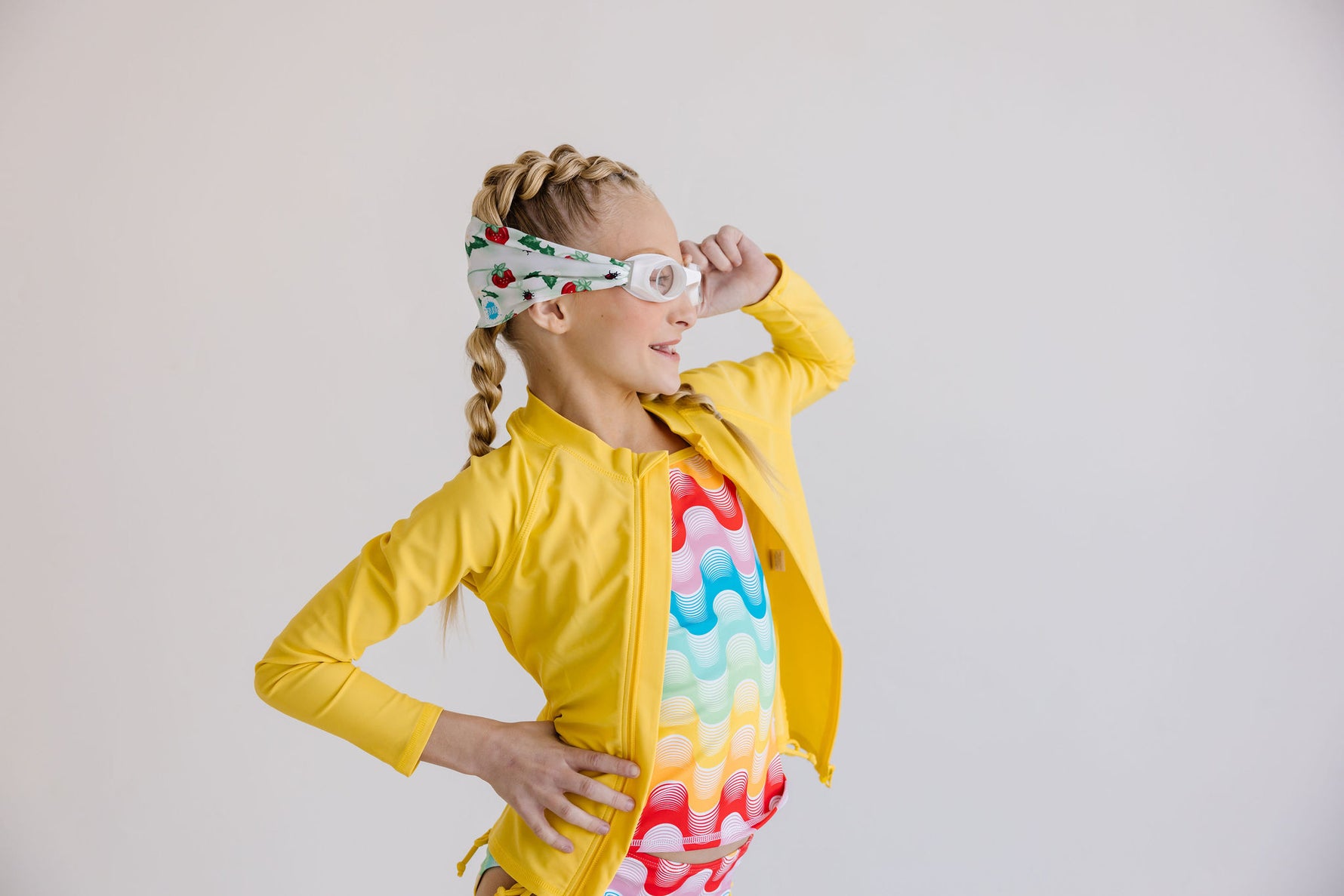 Our Strawberry Fields swim goggle features our tangle-free strap in a Strawberry and ladybug print on a light green and white background. Paired with a white frame and clear lenses.