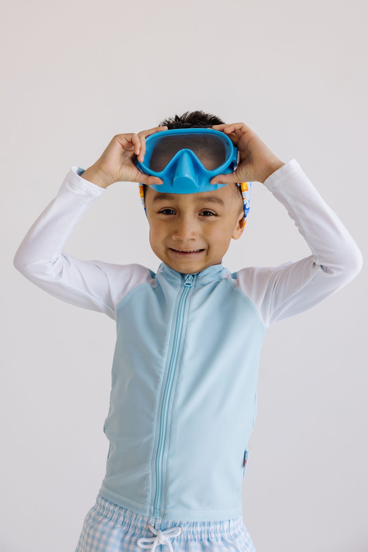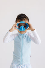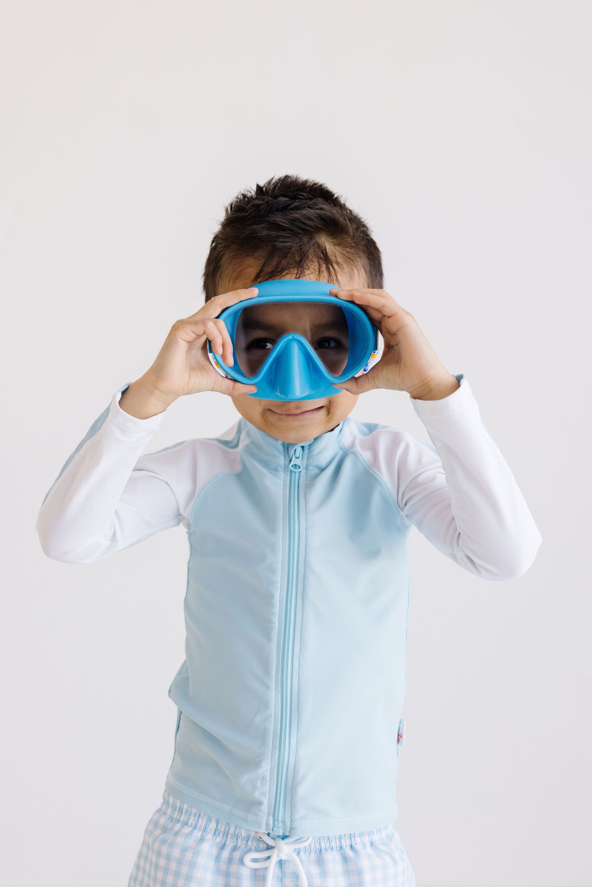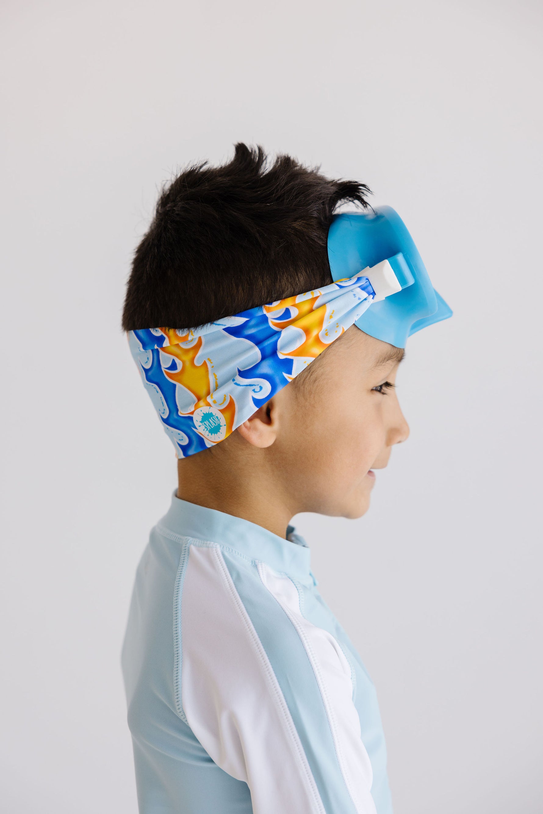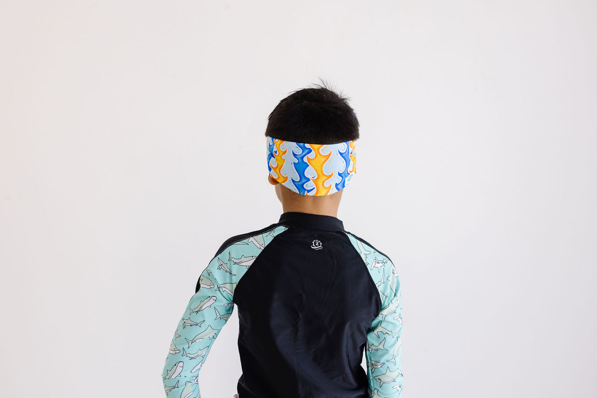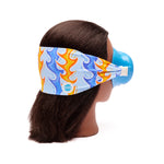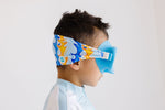 Our Blaze face mask swim goggle features an orange and blue flame print on a light blue background, paired with a blue frame and clear lenses.