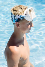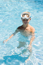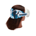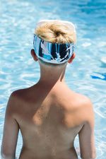 Our Boardwalk face mask swim goggle features a blue, white & black abstract palm print, paired with a white frame and clear lenses.