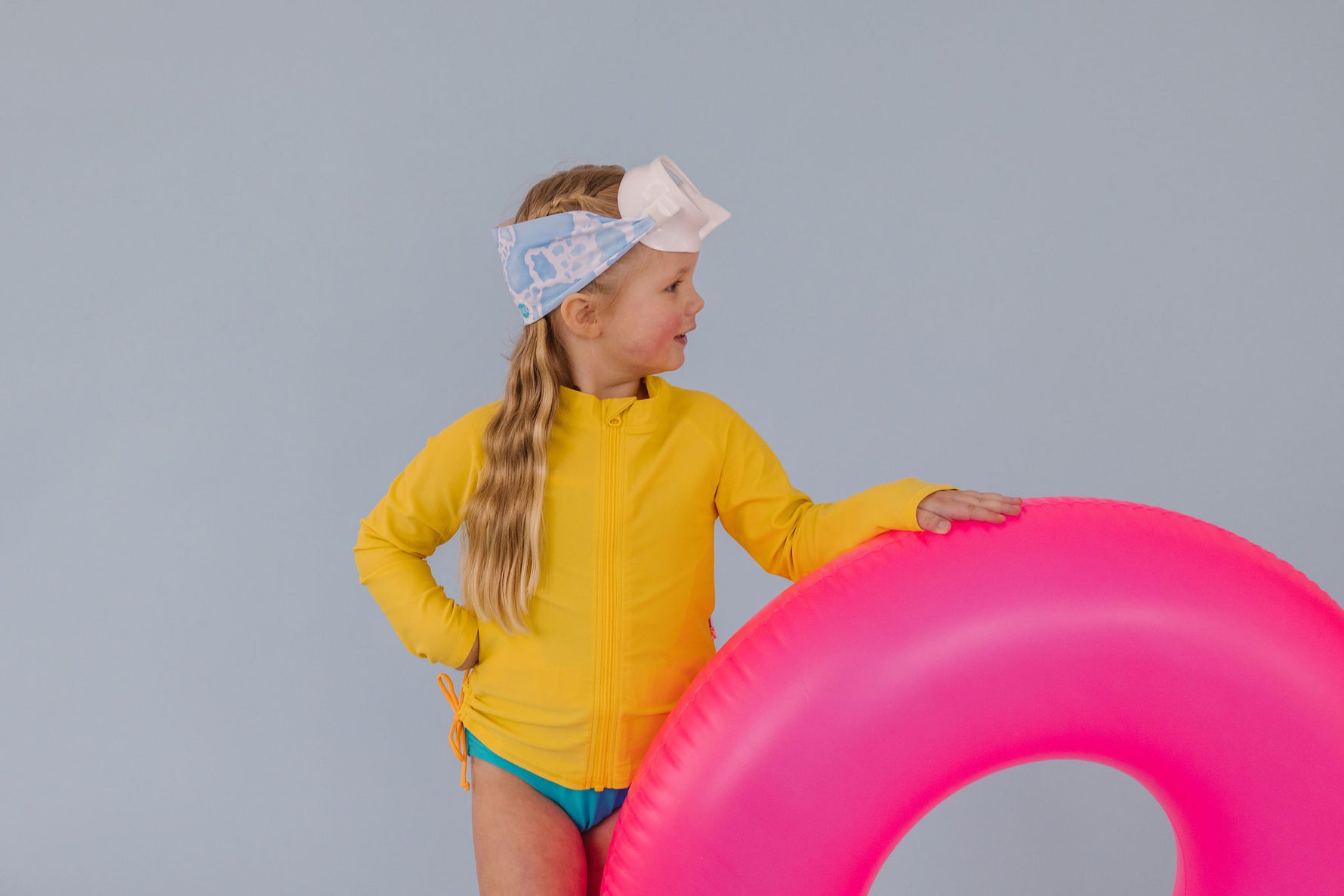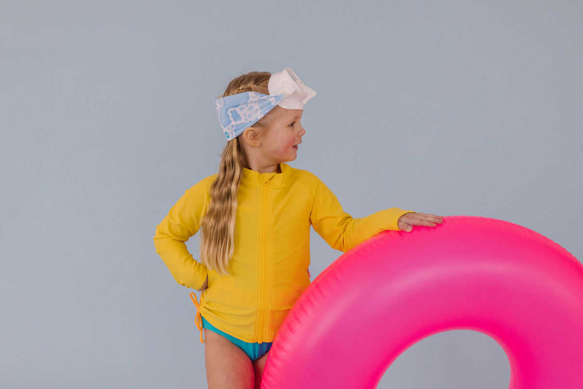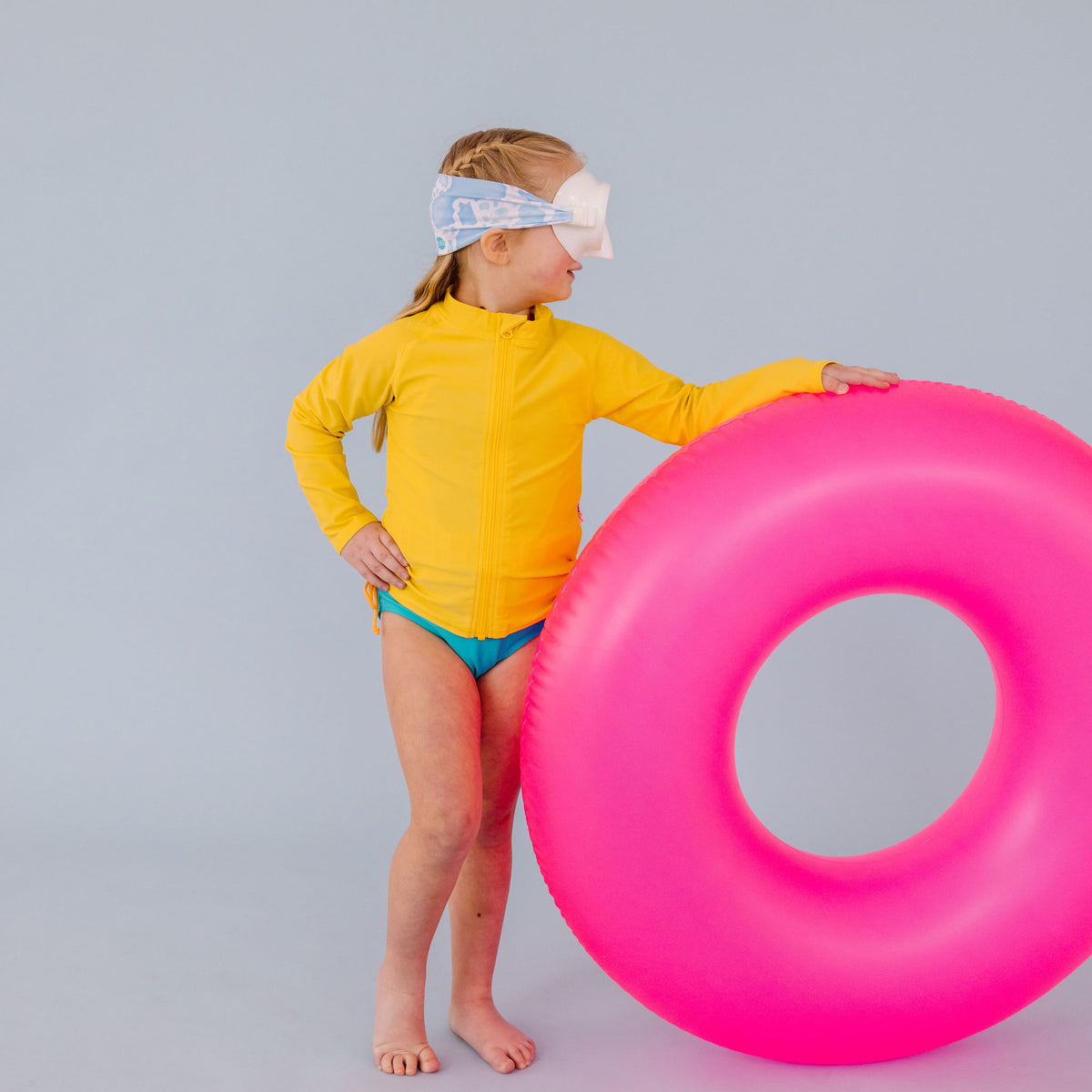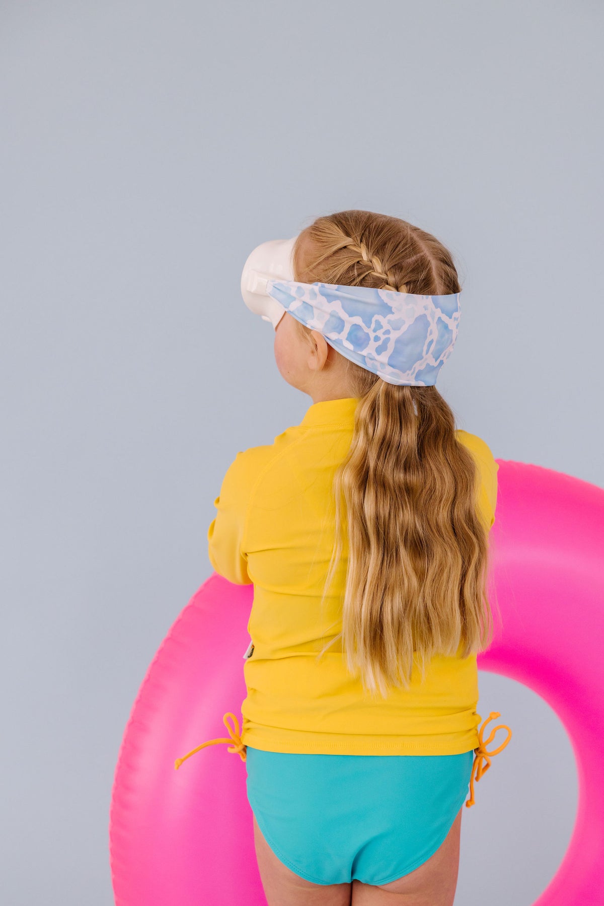 Our Bubbles face mask swim goggle features a light blue and white print, paired with a white frame and clear lenses.