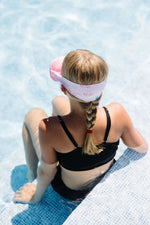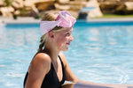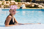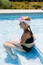 Our Cherry Charms face mask swim goggle features a light pink cherry and bow print paired with a light pink frame and clear lenses.