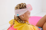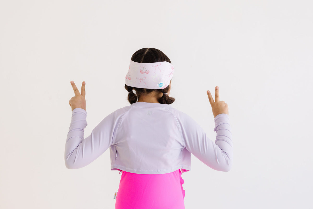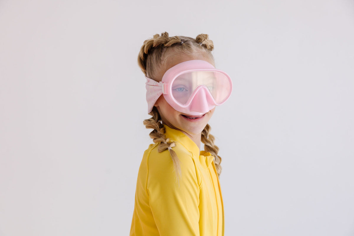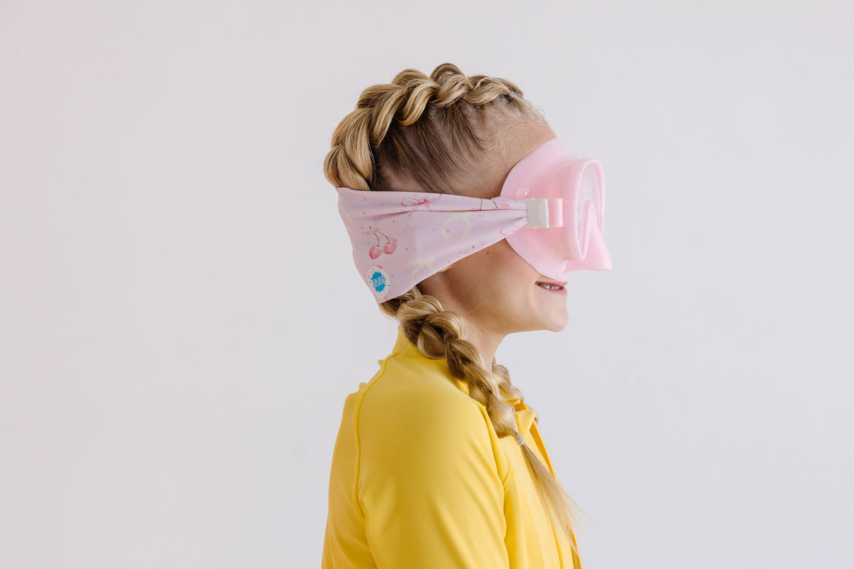 Our Cherry Charms face mask swim goggle features a light pink cherry and bow print paired with a light pink frame and clear lenses.