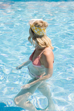 Our Daisy Love face mask swim goggle features a bright yellow and white daisy print. Paired with a white frame and clear lenses.