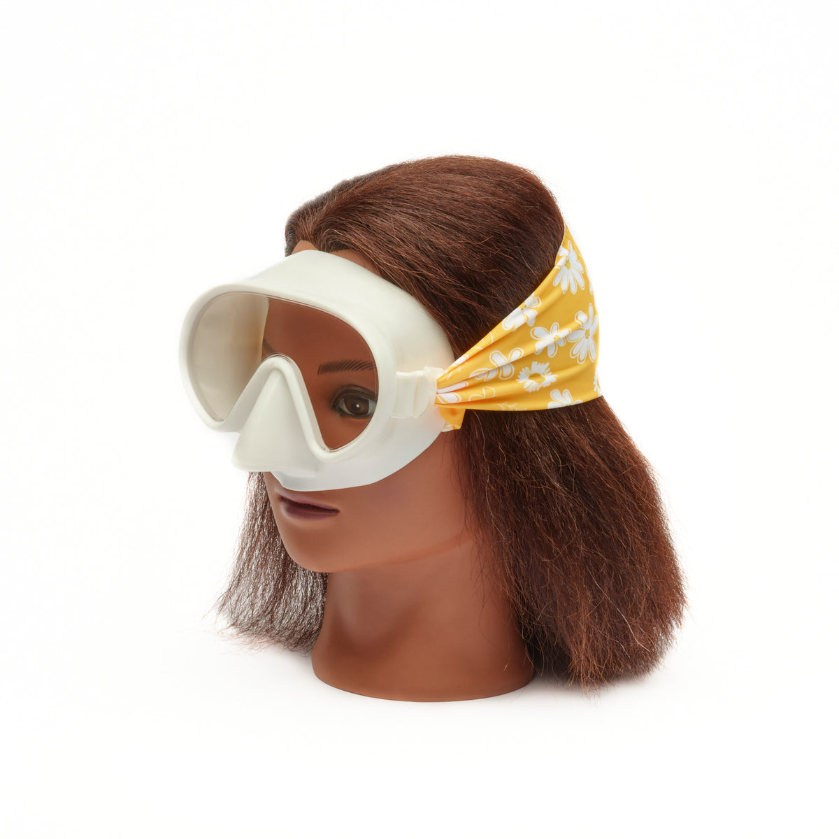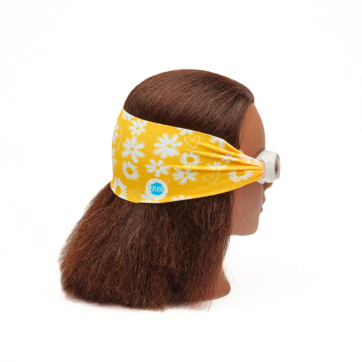 Our Daisy Love face mask swim goggle features a bright yellow and white daisy print, paired with a white frame and clear lenses.