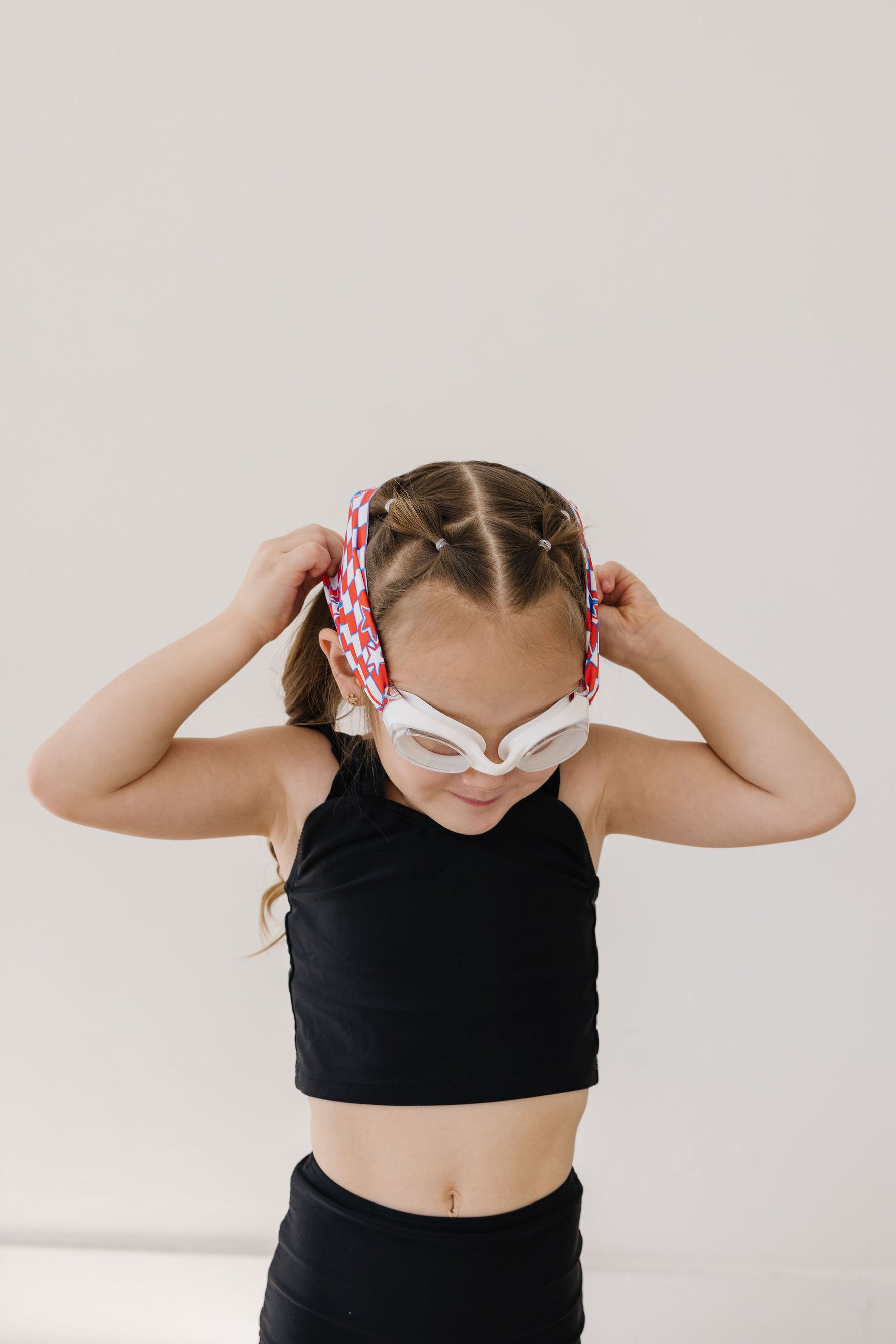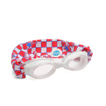 Our American Star swim goggle features our tangle-free strap in a red, white and blue star and checker print. Paired with a white frame and clear lenses.