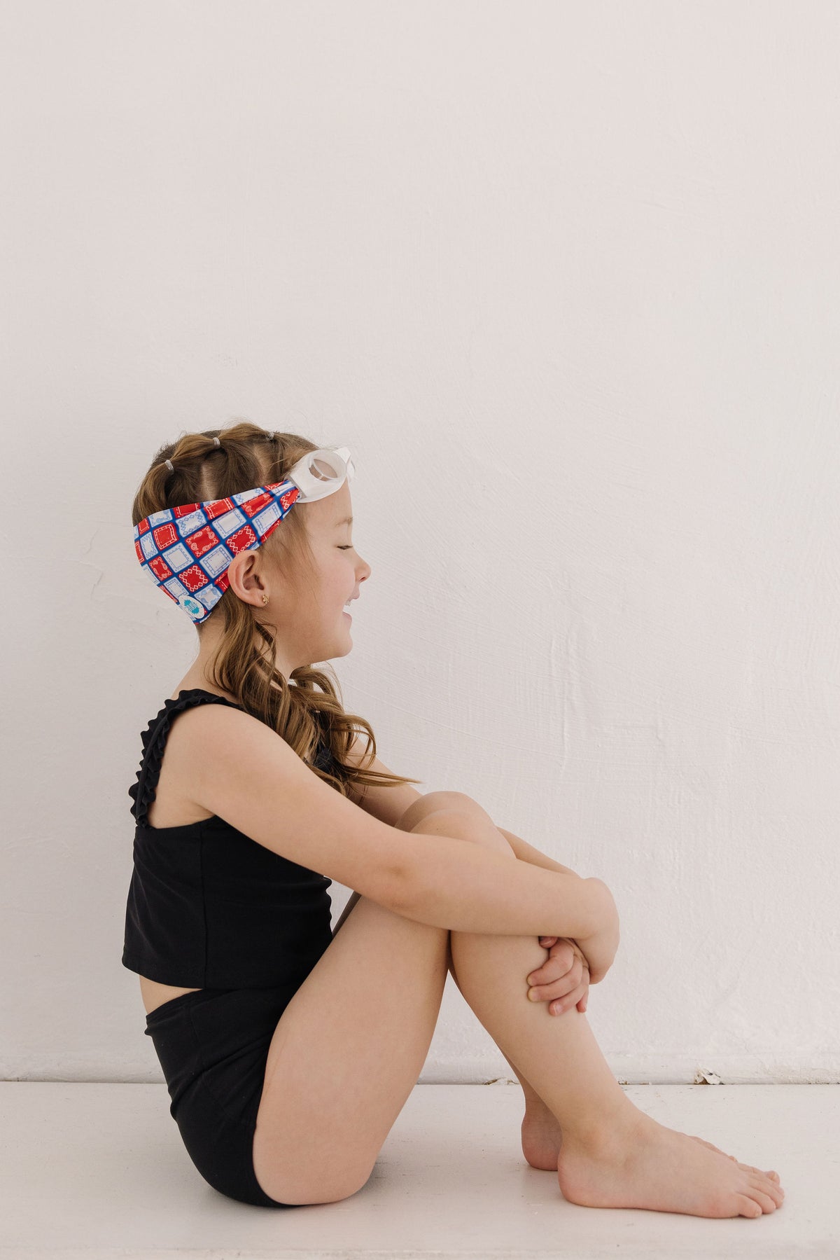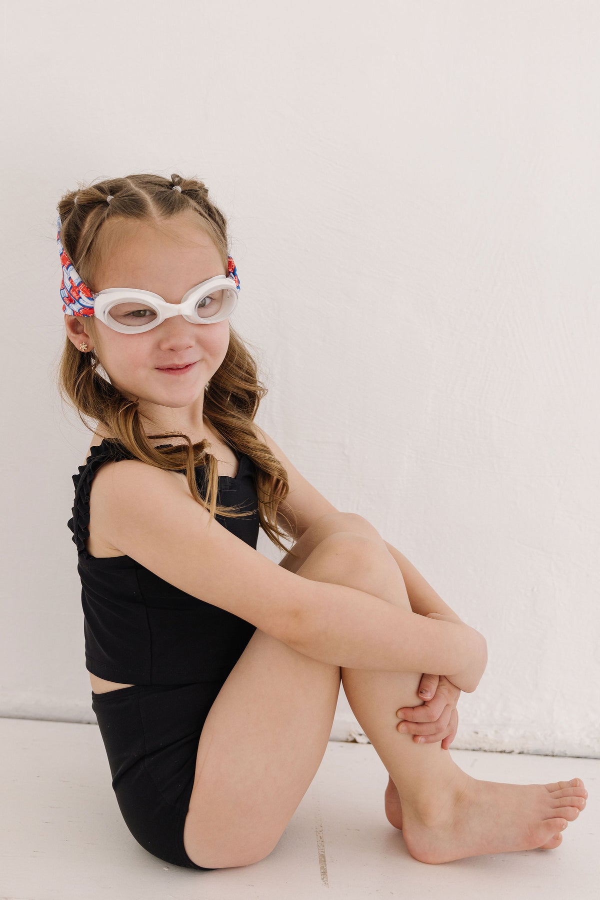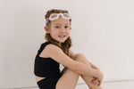 Our Giddy Up swim goggle features our tangle-free strap in a paisley red, white and blue print. Paired with a white frame and clear lenses.
