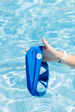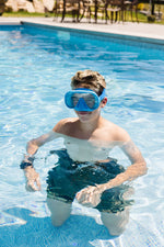 Our Royal face mask swim goggle features a solid matte blue strap, paired with a blue frame and clear lenses.