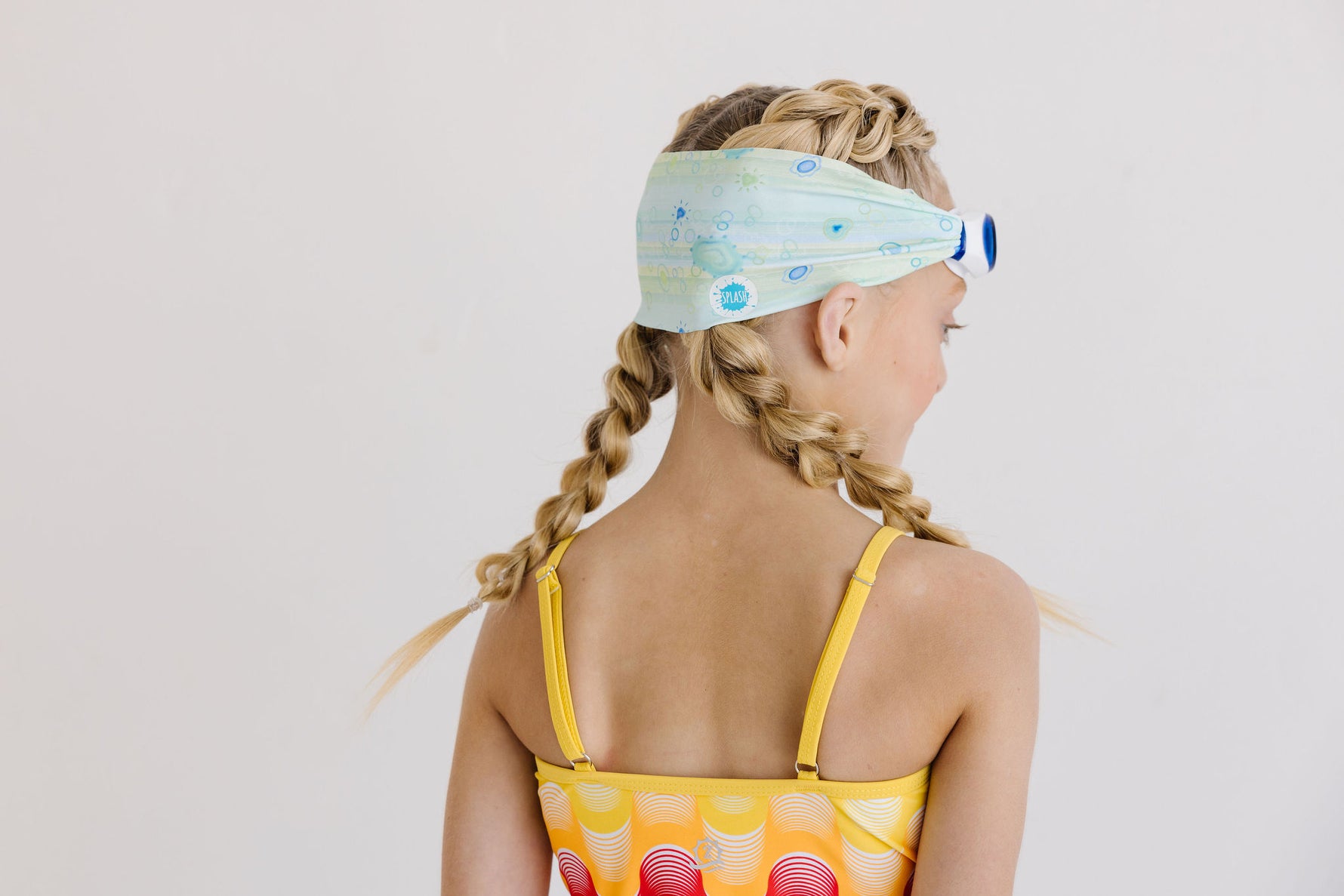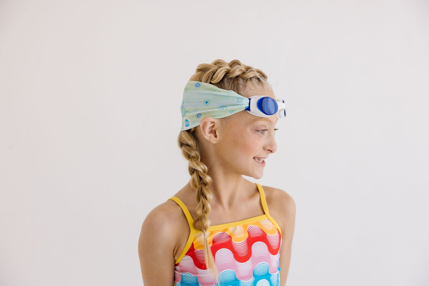 Our Sea Glass swim goggle features our tangle-free strap in a light blue and green print paired with white frames and lightly tinted blue lenses.